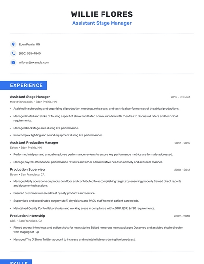 Build a professional assistant stage manager resume in minutes. Browse through our resume examples to identify the best way to word your resume. Then choose from 5+ resume templates to create your assistant stage manager resume.