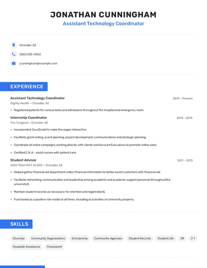Build a professional assistant technology coordinator resume in minutes. Browse through our resume examples to identify the best way to word your resume. Then choose from 5+ resume templates to create your assistant technology coordinator resume.
