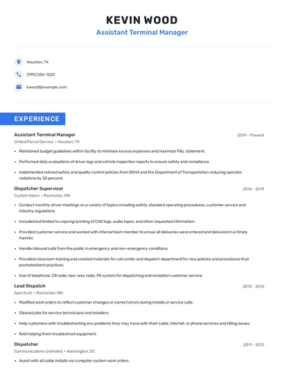 Build a professional assistant terminal manager resume in minutes. Browse through our resume examples to identify the best way to word your resume. Then choose from 5+ resume templates to create your assistant terminal manager resume.
