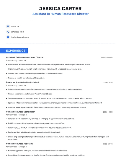 Build a professional assistant to human resources director resume in minutes. Browse through our resume examples to identify the best way to word your resume. Then choose from 5+ resume templates to create your assistant to human resources director resume.