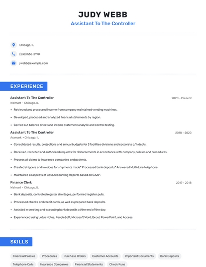 Build a professional assistant to the controller resume in minutes. Browse through our resume examples to identify the best way to word your resume. Then choose from 5+ resume templates to create your assistant to the controller resume.