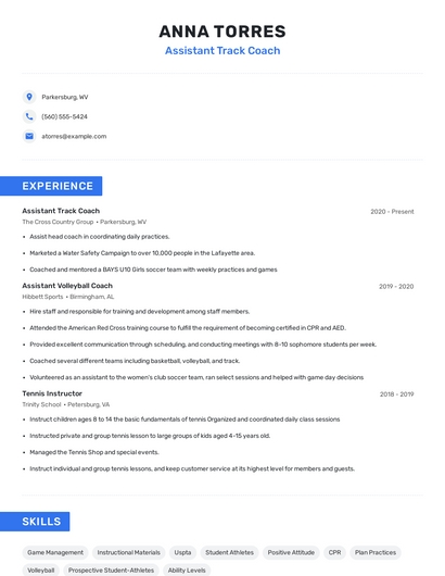 Build a professional assistant track coach resume in minutes. Browse through our resume examples to identify the best way to word your resume. Then choose from 5+ resume templates to create your assistant track coach resume.