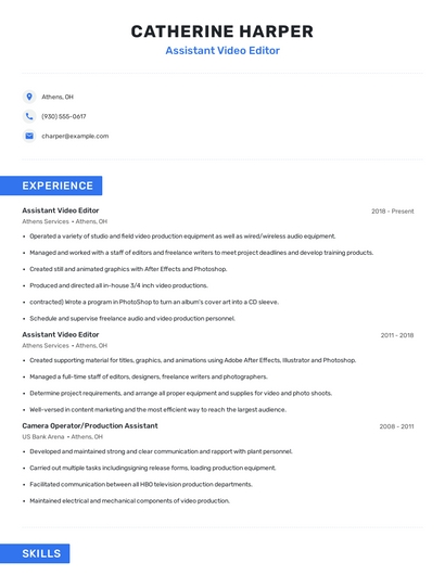 Build a professional assistant video editor resume in minutes. Browse through our resume examples to identify the best way to word your resume. Then choose from 5+ resume templates to create your assistant video editor resume.