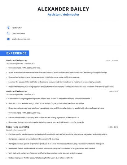 Build a professional assistant webmaster resume in minutes. Browse through our resume examples to identify the best way to word your resume. Then choose from 5+ resume templates to create your assistant webmaster resume.