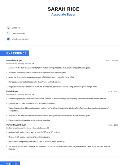 Build a professional associate buyer resume in minutes. Browse through our resume examples to identify the best way to word your resume. Then choose from 5+ resume templates to create your associate buyer resume.