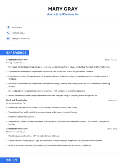 Build a professional associate/contractor resume in minutes. Browse through our resume examples to identify the best way to word your resume. Then choose from 5+ resume templates to create your associate/contractor resume.