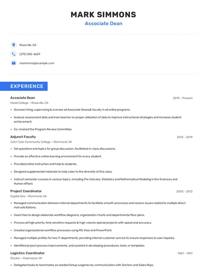 Build a professional associate dean resume in minutes. Browse through our resume examples to identify the best way to word your resume. Then choose from 5+ resume templates to create your associate dean resume.
