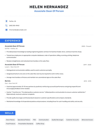 Build a professional associate dean of person resume in minutes. Our AI resume writing assistant will guide you through every step of the process, and you can choose from 10+ resume templates to create your associate dean of person resume.7. Store Policies