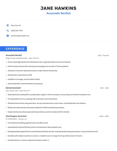 Build a professional associate dentist resume in minutes. Browse through our resume examples to identify the best way to word your resume. Then choose from 5+ resume templates to create your associate dentist resume.