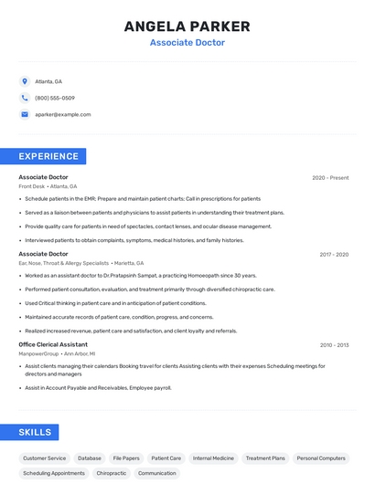 Build a professional associate doctor resume in minutes. Browse through our resume examples to identify the best way to word your resume. Then choose from 5+ resume templates to create your associate doctor resume.