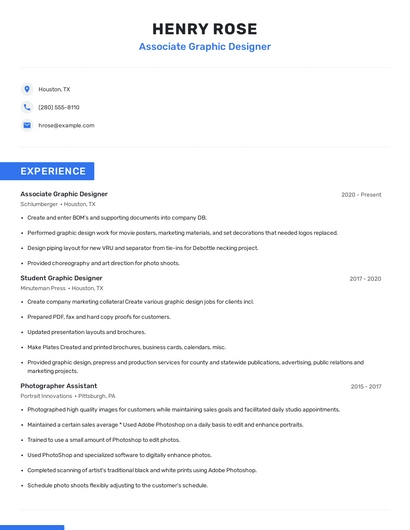 Build a professional associate graphic designer resume in minutes. Browse through our resume examples to identify the best way to word your resume. Then choose from 5+ resume templates to create your associate graphic designer resume.