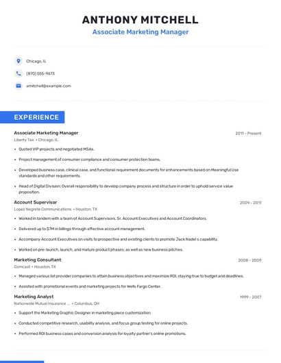 Build a professional associate marketing manager resume in minutes. Browse through our resume examples to identify the best way to word your resume. Then choose from 5+ resume templates to create your associate marketing manager resume.