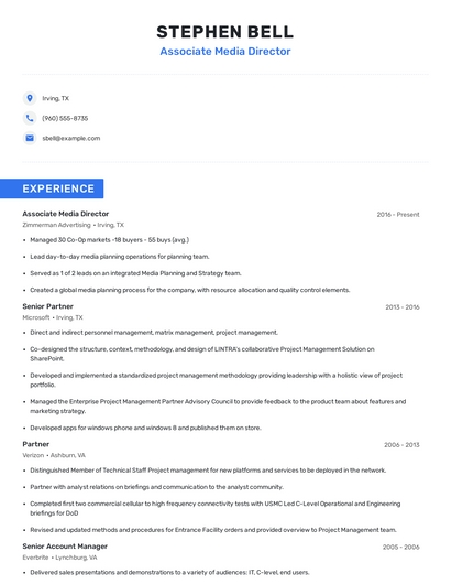 Build a professional associate media director resume in minutes. Browse through our resume examples to identify the best way to word your resume. Then choose from 5+ resume templates to create your associate media director resume.