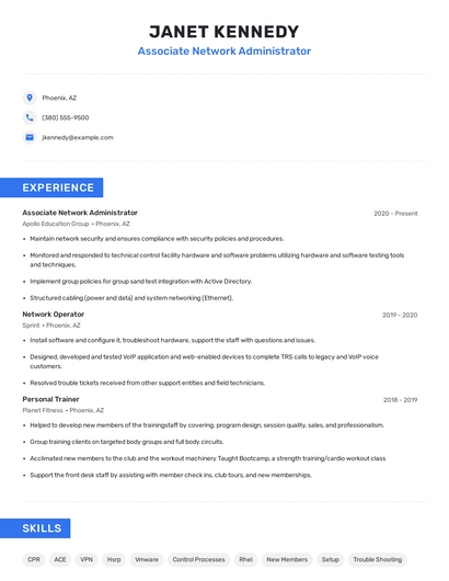 Build a professional associate network administrator resume in minutes. Browse through our resume examples to identify the best way to word your resume. Then choose from 5+ resume templates to create your associate network administrator resume.