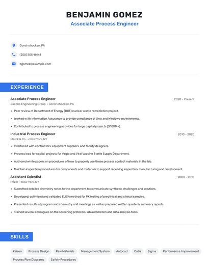 Build a professional associate process engineer resume in minutes. Browse through our resume examples to identify the best way to word your resume. Then choose from 5+ resume templates to create your associate process engineer resume.
