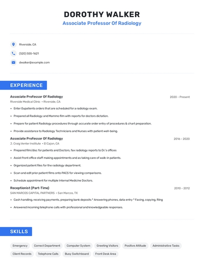 Build a professional associate professor of radiology resume in minutes. Browse through our resume examples to identify the best way to word your resume. Then choose from 5+ resume templates to create your associate professor of radiology resume.