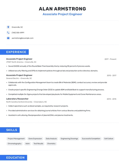 Build a professional associate project engineer resume in minutes. Browse through our resume examples to identify the best way to word your resume. Then choose from 5+ resume templates to create your associate project engineer resume.
