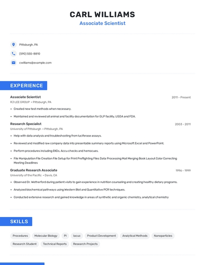 Build a professional associate scientist resume in minutes. Browse through our resume examples to identify the best way to word your resume. Then choose from 5+ resume templates to create your associate scientist resume.