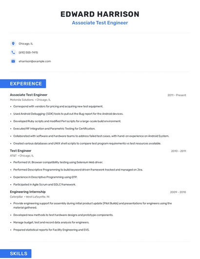 Build a professional associate test engineer resume in minutes. Browse through our resume examples to identify the best way to word your resume. Then choose from 5+ resume templates to create your associate test engineer resume.