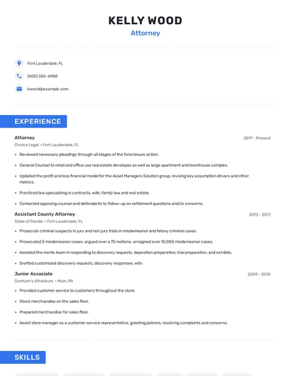 Build a professional attorney resume in minutes. Browse through our resume examples to identify the best way to word your resume. Then choose from 5+ resume templates to create your attorney resume.