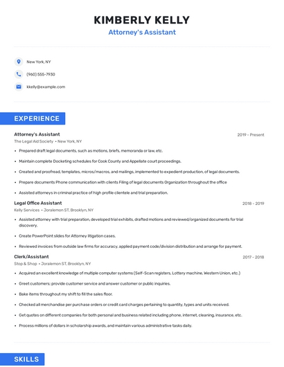 Build a professional attorney's assistant resume in minutes. Browse through our resume examples to identify the best way to word your resume. Then choose from 5+ resume templates to create your attorney's assistant resume.
