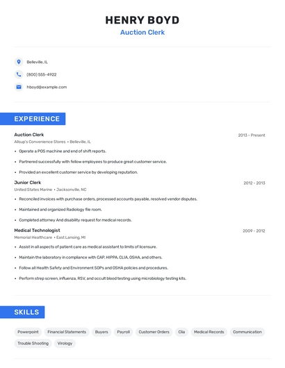 Build a professional auction clerk resume in minutes. Our AI resume writing assistant will guide you through every step of the process, and you can choose from 10+ resume templates to create your auction clerk resume.7. Health Procedures