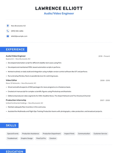 Build a professional audio/video engineer resume in minutes. Browse through our resume examples to identify the best way to word your resume. Then choose from 5+ resume templates to create your audio/video engineer resume.