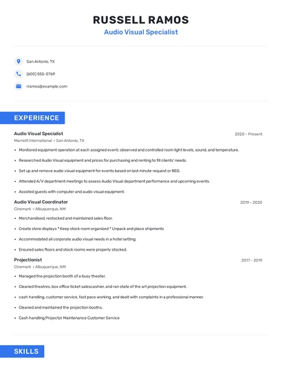 Build a professional audio visual specialist resume in minutes. Browse through our resume examples to identify the best way to word your resume. Then choose from 5+ resume templates to create your audio visual specialist resume.