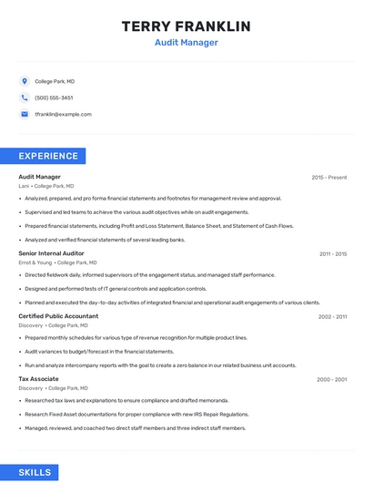 Build a professional audit manager resume in minutes. Browse through our resume examples to identify the best way to word your resume. Then choose from 5+ resume templates to create your audit manager resume.