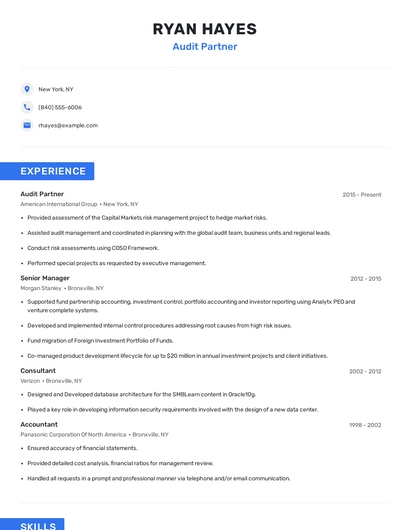 Build a professional audit partner resume in minutes. Browse through our resume examples to identify the best way to word your resume. Then choose from 5+ resume templates to create your audit partner resume.