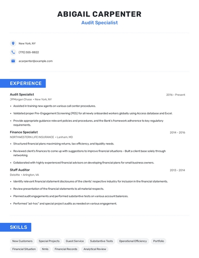 Build a professional audit specialist resume in minutes. Browse through our resume examples to identify the best way to word your resume. Then choose from 5+ resume templates to create your audit specialist resume.
