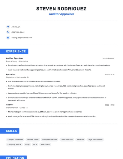 Build a professional auditor appraiser resume in minutes. Our AI resume writing assistant will guide you through every step of the process, and you can choose from 10+ resume templates to create your auditor appraiser resume.7. Property Valuation
