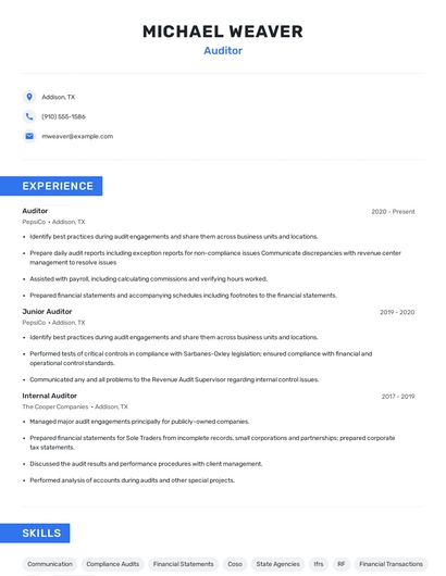 Build a professional auditor resume in minutes. Browse through our resume examples to identify the best way to word your resume. Then choose from 5+ resume templates to create your auditor resume.