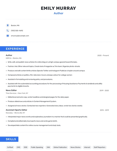 Build a professional author resume in minutes. Browse through our resume examples to identify the best way to word your resume. Then choose from 5+ resume templates to create your author resume.