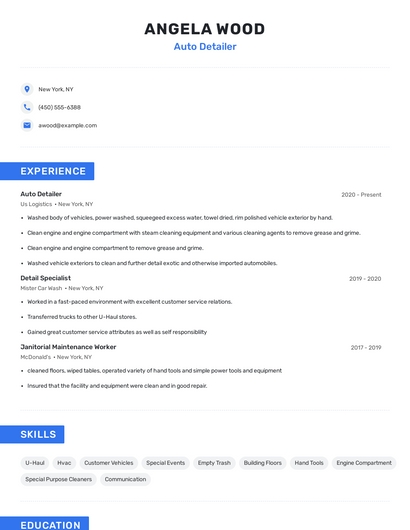 Build a professional auto detailer resume in minutes. Browse through our resume examples to identify the best way to word your resume. Then choose from 5+ resume templates to create your auto detailer resume.
