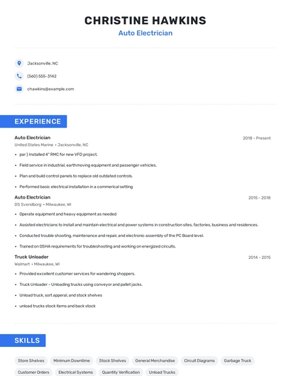Build a professional auto electrician resume in minutes. Our AI resume writing assistant will guide you through every step of the process, and you can choose from 10+ resume templates to create your auto electrician resume.7. Electrical Troubleshooting