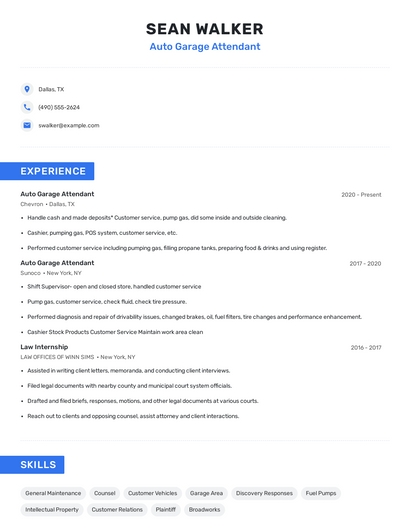 The most important skills for an auto garage attendant resume and required skills for an auto garage attendant to have include: