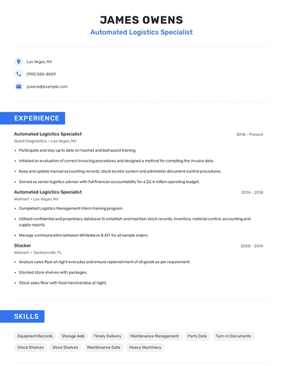 Build a professional automated logistics specialist resume in minutes. Browse through our resume examples to identify the best way to word your resume. Then choose from 5+ resume templates to create your automated logistics specialist resume.