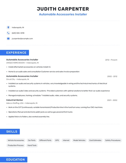 Build a professional automobile accessories installer resume in minutes. Browse through our resume examples to identify the best way to word your resume. Then choose from 5+ resume templates to create your automobile accessories installer resume.