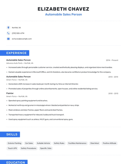 Build a professional automobile sales person resume in minutes. Browse through our resume examples to identify the best way to word your resume. Then choose from 5+ resume templates to create your automobile sales person resume.