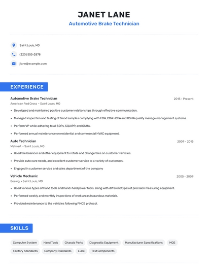 Build a professional automotive brake technician resume in minutes. Browse through our resume examples to identify the best way to word your resume. Then choose from 5+ resume templates to create your automotive brake technician resume.