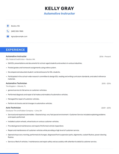 Build a professional automotive instructor resume in minutes. Browse through our resume examples to identify the best way to word your resume. Then choose from 5+ resume templates to create your automotive instructor resume.