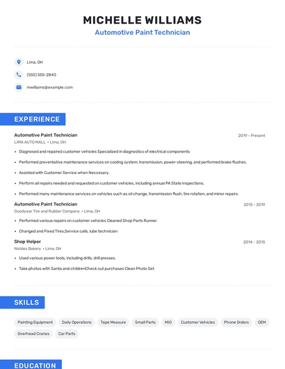 Build a professional automotive paint technician resume in minutes. Browse through our resume examples to identify the best way to word your resume. Then choose from 5+ resume templates to create your automotive paint technician resume.