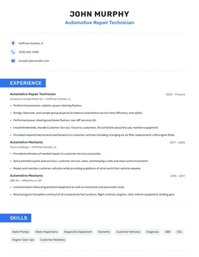 Build a professional automotive repair technician resume in minutes. Browse through our resume examples to identify the best way to word your resume. Then choose from 5+ resume templates to create your automotive repair technician resume.