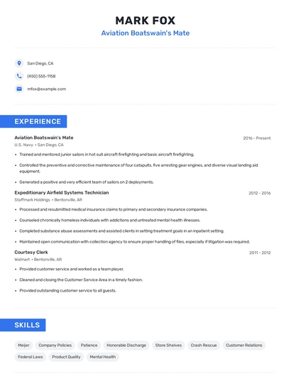 Build a professional aviation boatswain's mate resume in minutes. Our AI resume writing assistant will guide you through every step of the process, and you can choose from 10+ resume templates to create your aviation boatswain's mate resume.7. Sailors