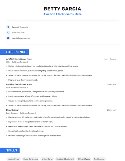 Build a professional aviation electrician's mate resume in minutes. Browse through our resume examples to identify the best way to word your resume. Then choose from 5+ resume templates to create your aviation electrician's mate resume.