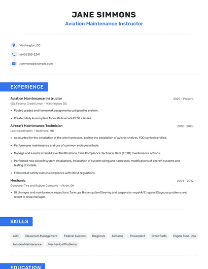 Build a professional aviation maintenance instructor resume in minutes. Browse through our resume examples to identify the best way to word your resume. Then choose from 5+ resume templates to create your aviation maintenance instructor resume.