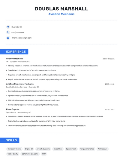 Build a professional aviation mechanic resume in minutes. Browse through our resume examples to identify the best way to word your resume. Then choose from 5+ resume templates to create your aviation mechanic resume.