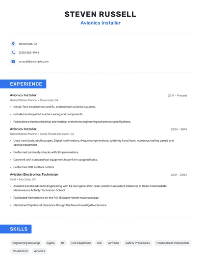Build a professional avionics installer resume in minutes. Browse through our resume examples to identify the best way to word your resume. Then choose from 5+ resume templates to create your avionics installer resume.