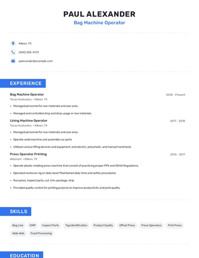 Build a professional bag machine operator resume in minutes. Browse through our resume examples to identify the best way to word your resume. Then choose from 5+ resume templates to create your bag machine operator resume.